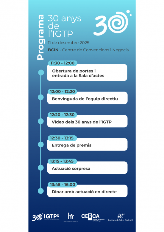 L’IGTP us convida a l'aperitiu de Nadal d'aquest any per la celebració del seu 30è aniversari. Aquesta fita ha estat possible gràcies a tots i totes vosaltres, i ens encantaria comptar amb la vostra presència. Descobreix més sobre la nostra història i el 30è aniversari aquí.