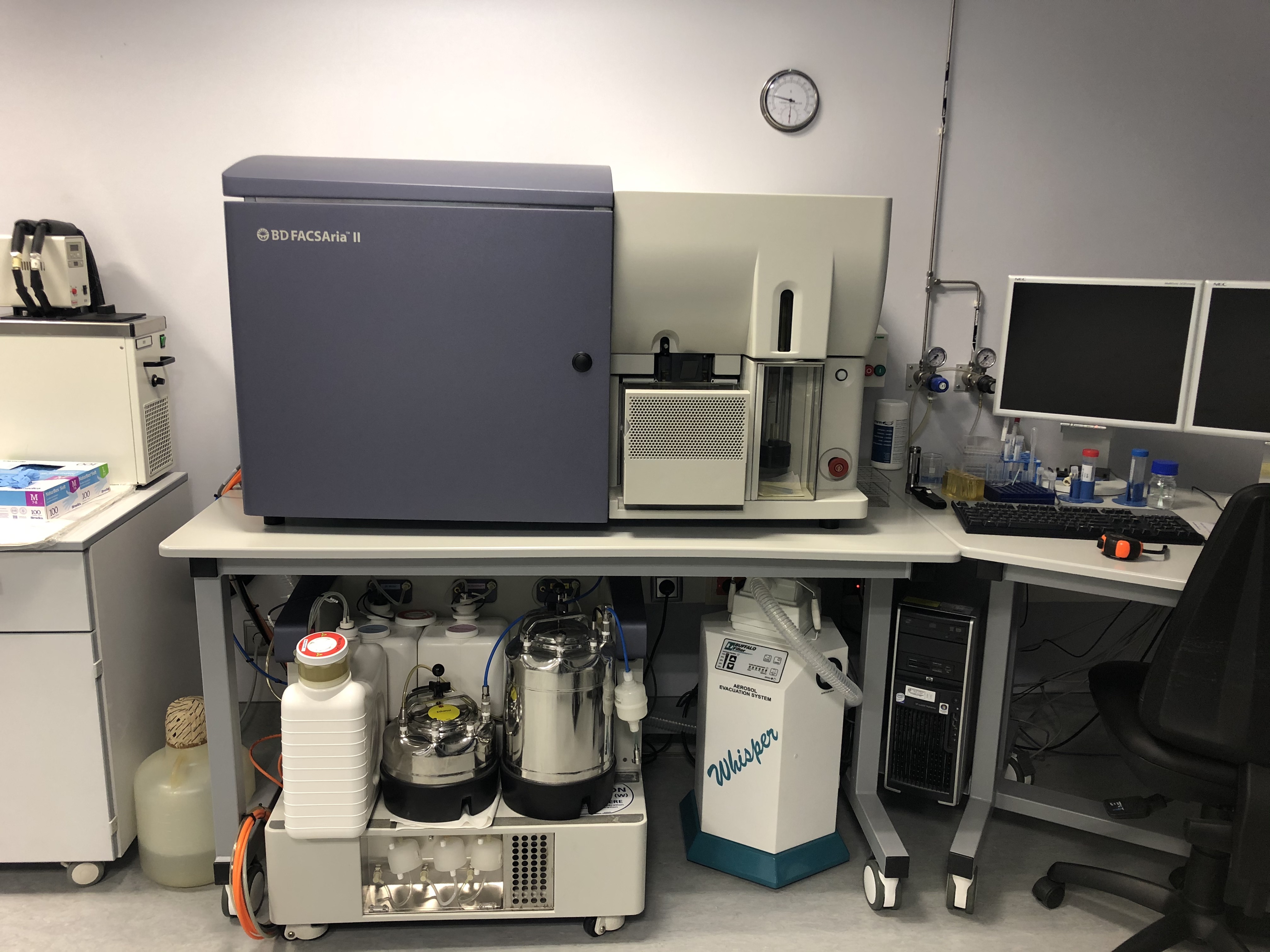 Tres líneas de lásers (405, 488 y 633 nm), quince detectores (trece fluorescencias y dos parámetros de dispersión de luz). ACDU (Automated Cell Deposition Unit) para separación en diferentes tipos de placas de pocillos y slides; opción single cell. Opciones instaladas: sistema de evacuación de aerosoles (AMO) y control de temperatura por baño refrigerado. Software FACSDiva.