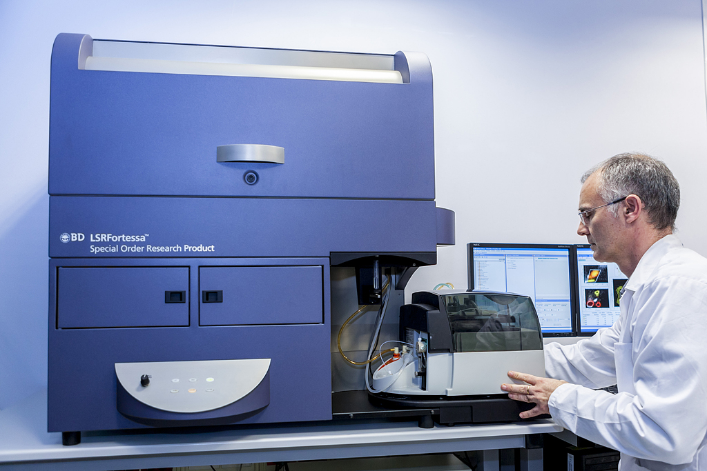 - El clasificador celular Bigfoot dispone de 5 láseres (350-nUV, 488-azul, 405-violeta, 561-amarillo/verde y 641-rojo nm) con hasta 53 detectores. Puede funcionar como citómetro convencional o de espectro completo; el spectral unmixing permite paneles de 30-40 colores. El Bigfoot está integrado en una cabina de bioseguridad BSL2 para garantizar la adquisición y clasificación de muestras cumpliendo el nivel de biocontención BSL2.
