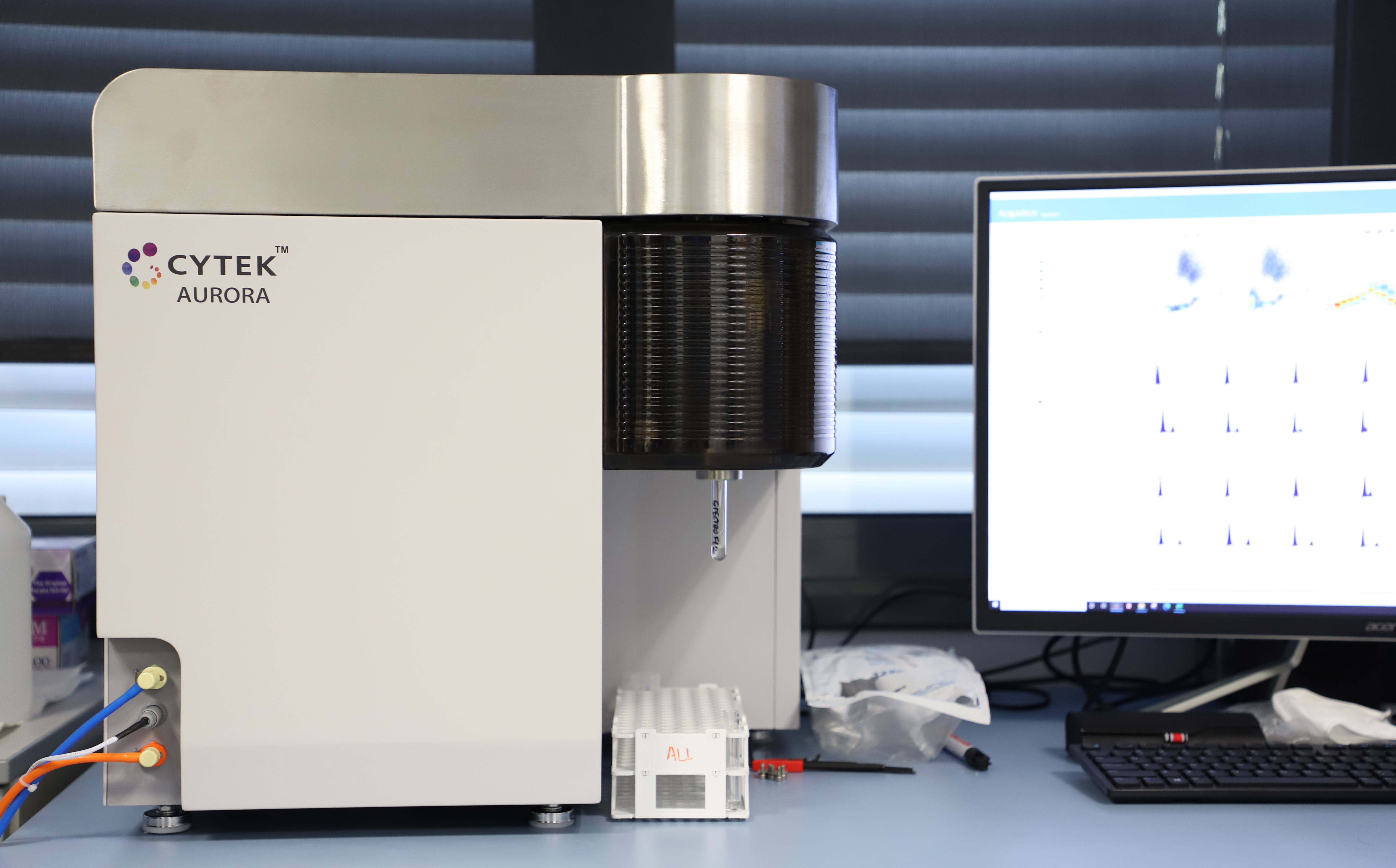 - Cytek Aurora dispone de 5 láseres (350-nUV, 488-azul, 405-violeta, 561-amarillo/verde y 641-rojo nm) con hasta 64 detectores. Funciona como un citómetro de espectro completo, permitiendo resolver paneles de 40-50 marcadores y gestionar múltiples sustracciones de autofluorescencia.